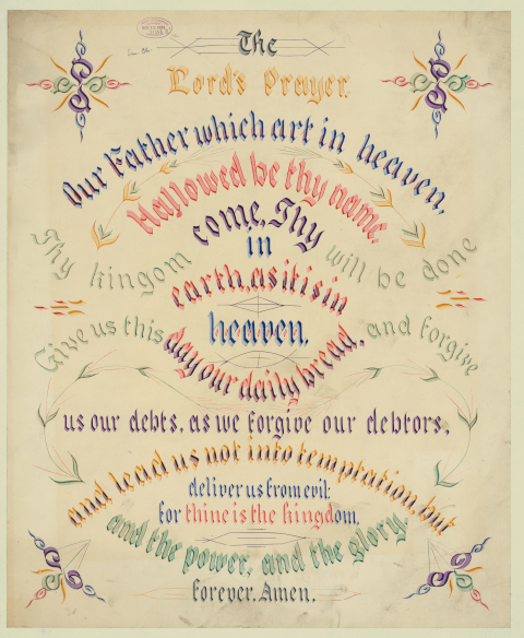 Coaley, John Morgan (1889). The Lord's prayer in ink and watercolor. https://commons.wikimedia.org/wiki/File:The_Lord's_prayer_LCCN2004662429.jpg